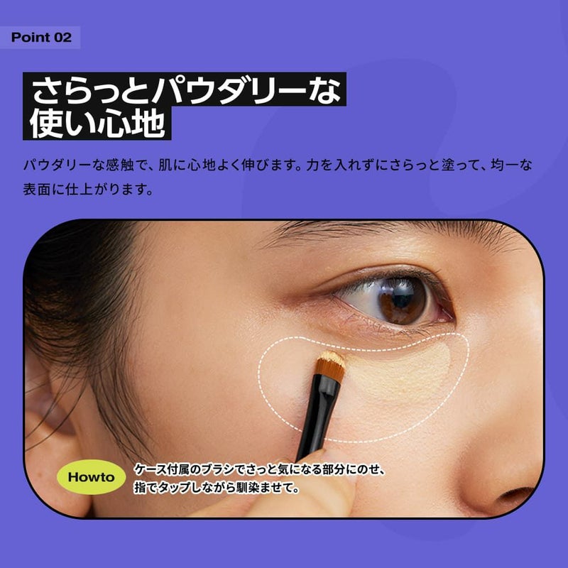 SPF15/PA+++ ブルーライトを軽減。 ホホバ油とシア脂のW 保湿成分でなめらかに目もとを保湿。 パウダリーな仕上がりと、ベタつきにくいオイルで簡単にオフ。 別売りの専用ケースにセットしてご使用ください。 ■Plus Y イエベ向けナチュラルオレンジベージュ。 とろけてさらっと密着クマを自然にカバー。 ■Plus B ブルベ向け血色ピンクベージュ。 とろけてさらっと密着クマを自然にカバー。