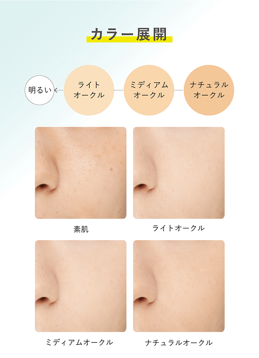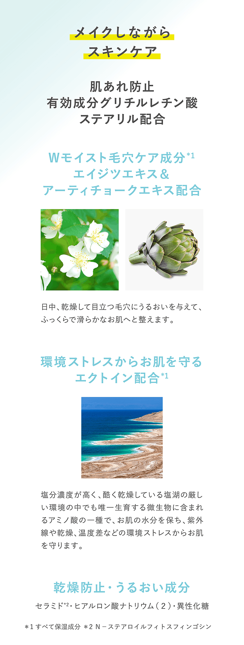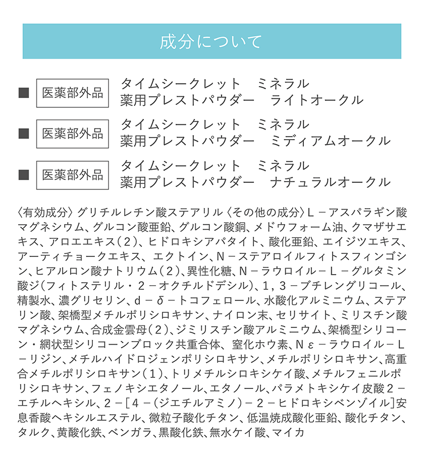 〈有効成分〉グリチルレチン酸ステアリル〈その他の成分〉L-アスパラギン酸マグネシウム、グルコン酸亜鉛、グルコン酸銅、メドウフォーム油、クマザサエキス、アロエエキス(2)、ヒドロキシアパタイト、酸化亜鉛、エイジツエキス、アーティチョークエキス、エクトイン、N-ステアロイルフィトスフィンゴシン、ヒアルロン酸ナトリウム(2)、異性化糖、N-ラウロイル-L-グルタミン酸ジ(フィトステリル・2-オクチルドデシル)、1,3-ブチレングリコール、精製水、濃グリセリン、d-δトコフェロール、水酸化アルミニウム、ステアリン酸、架橋型メチルポリシロキサン、ナイロン末、セリサイト、ミリスチン酸マグネシウム、合成金雲母(2)、ジミリスチン酸アルミニウム、架橋型シリコーン・網状型シリコーンブロック共重合体、窒化ホウ素、Nε-ラウロイル-L-リジン、メチルハイドロジェンポリシロキサン、メチルポリシロキサン、高重合メチルポリシロキサン(1)、トリメチルシロキシケイ酸、メチルフェニルポリシロキサン、フェノキシエタノール、エタノール、パラメトキシケイ皮酸2-エチルヘキシル、2-[4-(ジエチルアミノ)-2-ヒドロキシベンゾイル]安息香酸ヘキシルエステル、微粒子酸化チタン、低温焼成酸化亜鉛、酸化チタン、タルク、黄酸化鉄、ベンガラ、黒酸化鉄、無水ケイ酸、マイカ