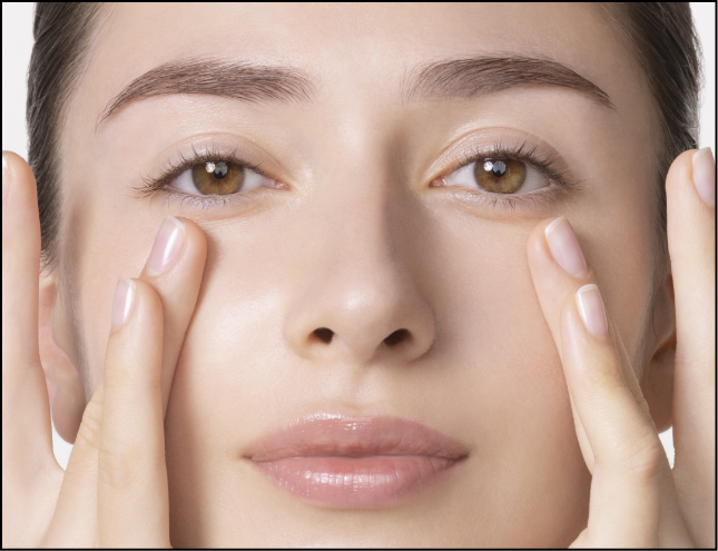 ② 目頭の下から目尻にそって美容液を塗り、薬指でやさしくなじませます。