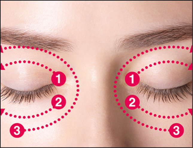 ③ そのまま薬指で目尻の下から目頭にそって指をすべらせ、そのまま目頭を通って円を描くように目尻まで力を入れず、やさしくなじませます。